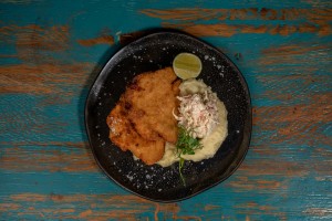 Salată Romaine, Șnițel de Curcan, Parmezan, Castravete, Rosii Cherry, Crutoane, Dressing Caesar
