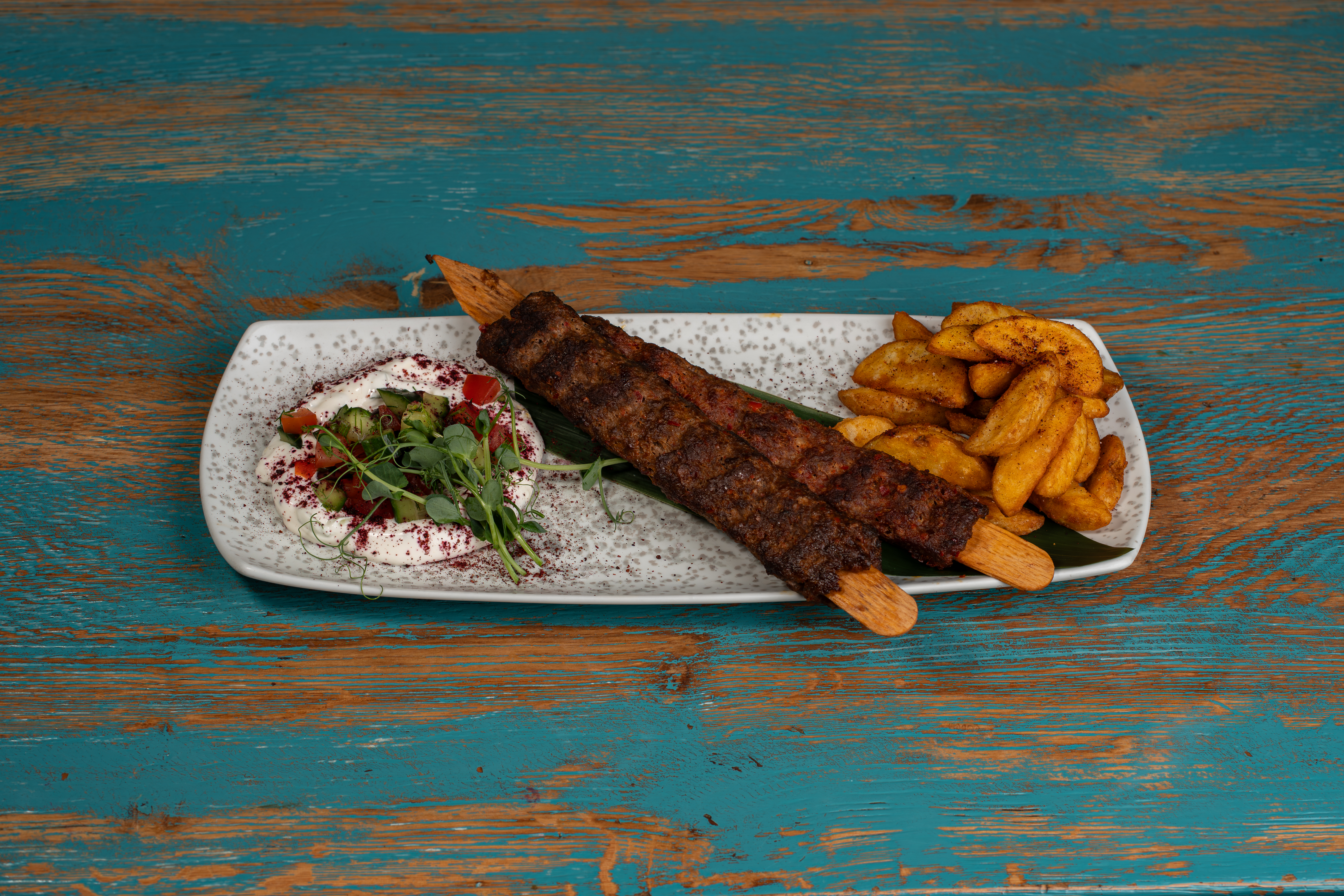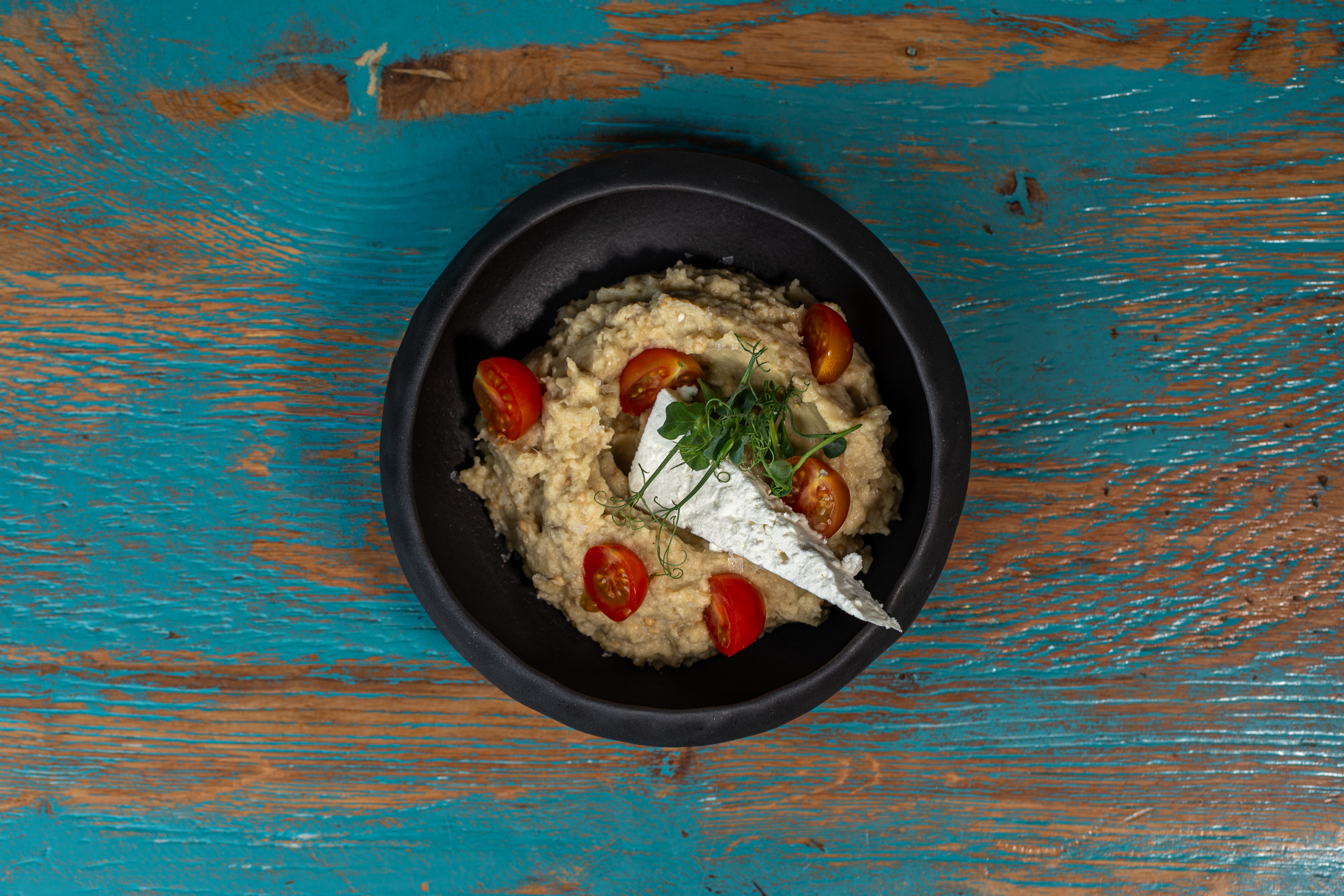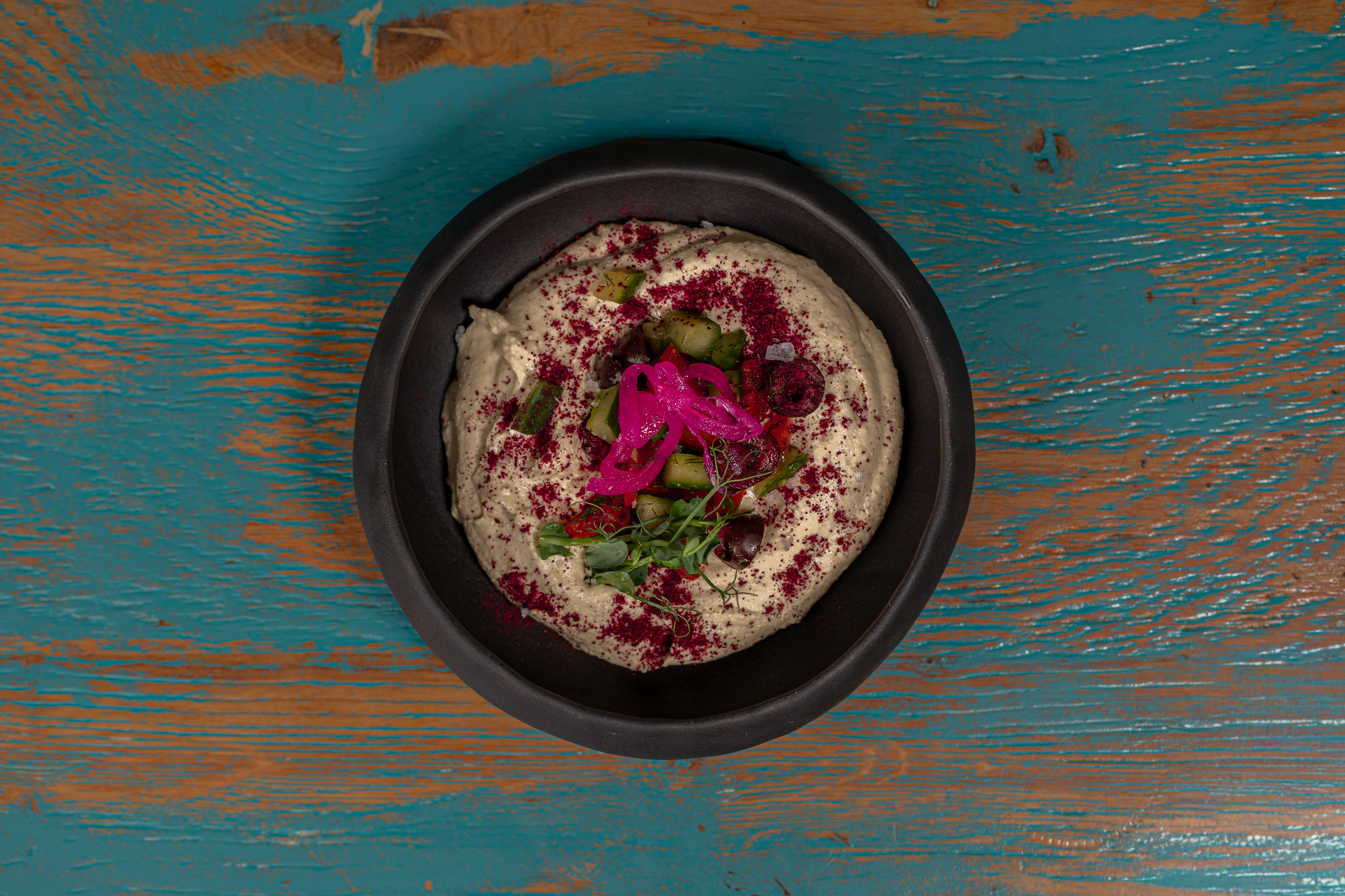 Năut, Pastă Tahini, Chimion, Usturoi, Măsline Kalamata, Roșie, Castravete, Sumac, Pită Grecească